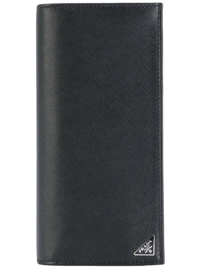 Black leather vertical bi-fold wallet from Prada featuring a main internal compartment, an interior zipped compartment and multiple interior card slots.
