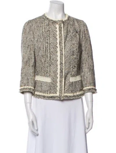 Prada Tweed Jacket Vintage From the 2000's Collection by Miuccia Prada Grey Tweed Pattern Lace, Pleated & Raw-Edge Accents Collarless Patch Pockets & Snap Closure Designer Fit: Designed for a slim fit, those with a curvy figure may wish to take one size up. | Prada Vintage 2000's Jacket in Grey, Women's US6, IT42 | M