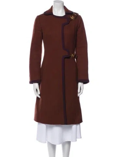 Prada Virgin Wool Coat Vintage From the Fall/Winter 2001 Collection by Miuccia Prada Brown & Purple Leather Trim Embellishment & Pointed Collar Long Snap Closure Fit: Coats by Prada typically fit true to size. | Prada Vintage 2001 Coat in Brown/Purple, Women's US8, IT44 | M