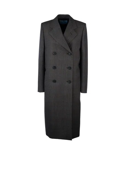 PRADA Long Length Belted Back Double-breasted Coats In Cacao Blue