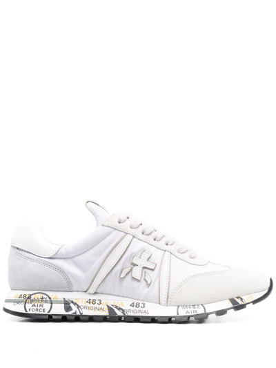 white/light grey/light beige panelled design suede panelling embroidered logo to the side embroidered stripes to the side logo patch at the tongue crystal-embellished contrasting branded heel counter text and graphic prints at the sole round toe front lace-up fastening padded ankle leather lining branded insole chunky rubber sole