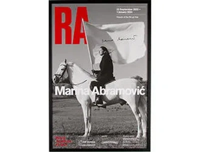 Serbian conceptual and performance artist, Marina Abramović who uses her own body as a medium and considers herself the "godmother of performance art". Perhaps the most famous performance artist working today, her work has spanned over 5 decades and she has worked with major museums and institutions around the world including MoMA, Royal Academy of Arts, Venice Biennale, among many others. To commemorate Marina Abramović's major solo exhibition, the RA Shop has designed three exclusive posters for you to gift or take home as a memento. This work is a signed exhibition poster of The Hero, 2023. | The Hero in Black/Grey, Large