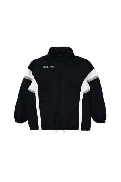The Prototypes Backless Tracksuit Jacket featuring contrasting paneled construction, a loose fit, stand collar, zip closure, embroidered logo at front, and an open back.. This is an upcycled garment, each piece will vary slightly.