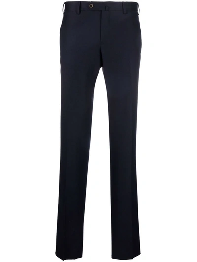 Blue virgin wool-blend slim-fit wool trousers from PT01 featuring off-centre front button fastening, belt loops, two side slash pockets, two rear welt pockets and slim fit.