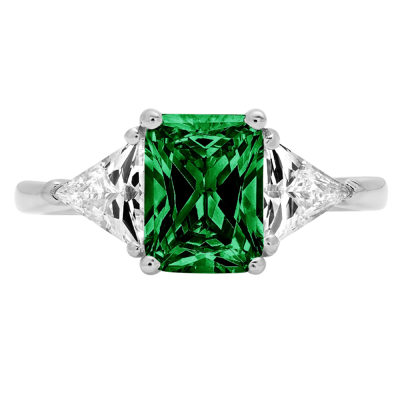 Pre-owned 3 Emerald Trillion 3stone Lab Created Emerald Classic Ring Solid 14k White Gold In Green