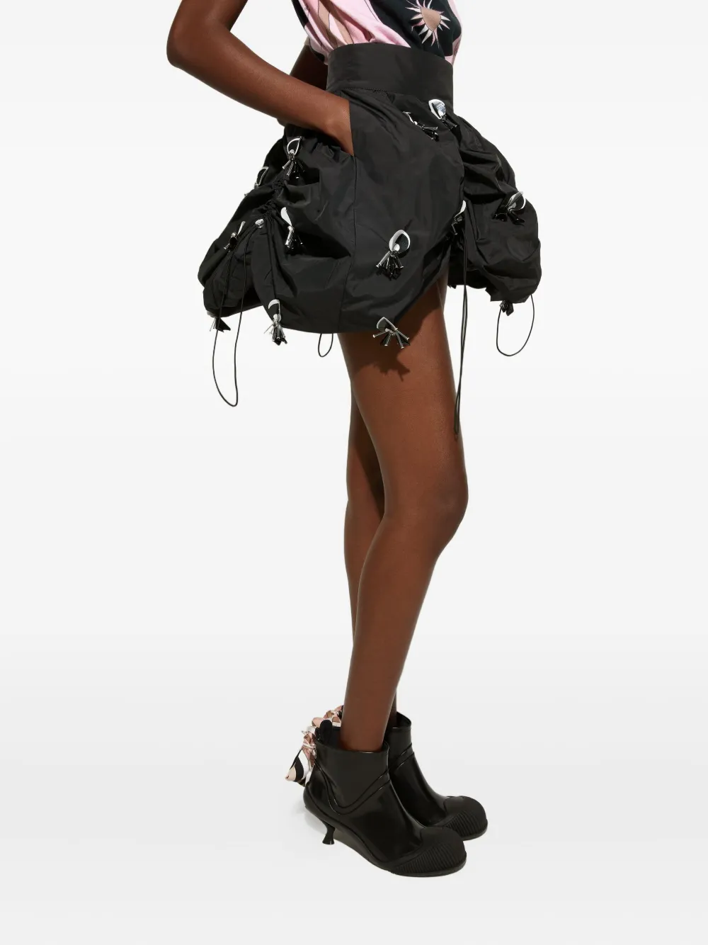black bubble hem drawstring detail multiple embellishments gathered fabric