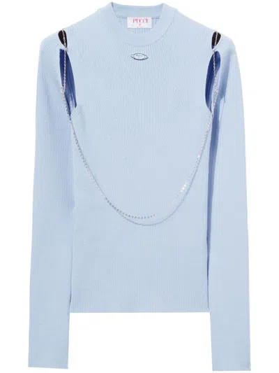 blue ribbed knit crew neck long sleeves cut-out detailing chain-link detailing straight hem internal logo patch