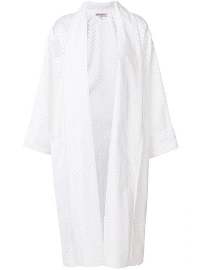 The perfect balance between work and play, this oversized white coat from Emilio Pucci is sure to inject an instant dose of glamour into any outfit. Expertly crafted in Italy from a breezy cotton-blend punctuated with delicate eyelets, the kimono-inspired voluminous silhouette boasts an open front with a shawl collar, long sleeves with turn up cuffs, a ladylike midi length and sizable patch pockets for a playful touch. Pair yours with bright colours and breezy shapes in an imaginative homage to the eternal appeal of the Pucci aesthetic.