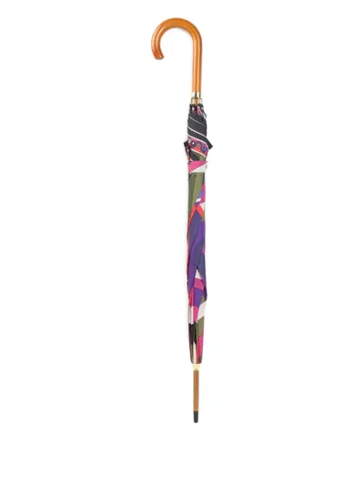 Pucci Multicolor Polyester Umbrella. Crafted from multicolor tech fabric, signature Iride print all over, brown wood handle, attachable tonal shoulder strap.