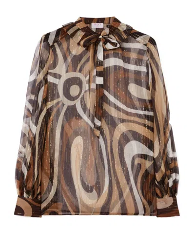 Wide sleeves with pleats at collar and cuffs, tie-up front, all-over print and pleated detail.