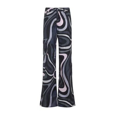Pucci Black Pants. Crafted in polyamide fabric. Front concealing zipped fastening, front buttoned fastening, belt loops, five pockets design, cargo pocket on the legs, flared leg, straight hem. Pink and grey geometric pattern all-over.