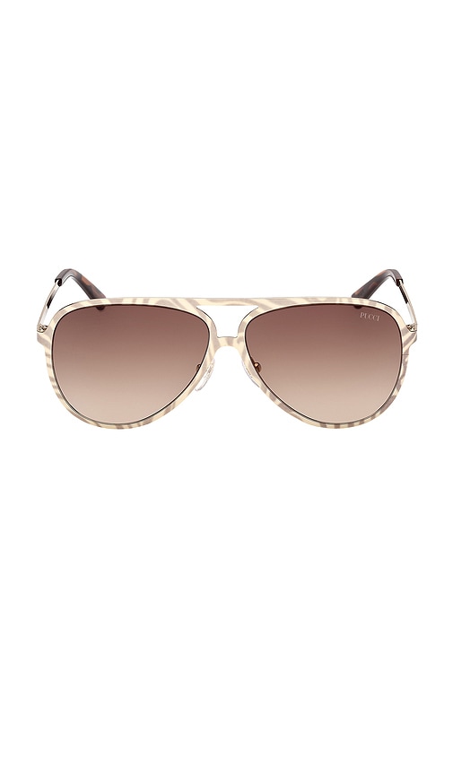 Emilio Pucci Pilot Sunglasses in Cream Metal frames. Lens measures approx 58mm. Bridge measures approx 12mm. Arm measures approx 140mm. EMIF-WG37. EP0247_5832F. About the designer: Florentine Italian designer Emilio Pucci crafted effortlessly elegant clothing in signature abstract, graphic prints inspired by Sicilian mosaics, heraldic banners, Bali Batiks and African motifs in a kaleidoscope of colors. Driven by the desire to liberate women through freedom of movement, his designs featured sensual, free-flowing lines that flattered the natural curves of the female body. Emilio Pucci heralded the concept of designer ready-to-wear, resulting in a cascading effect throughout the fashion industry. In April 2000, an alliance was formed between the Pucci family and LVMH, and in March 2015 the Italian designer Massimo Giorgetti was appointed Creative Director.