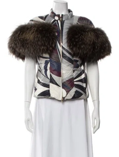 Emilio Pucci Down Jacket Grey Printed Fur Trim & Stand Collar Zip Pockets & Zip Closure Designer size 36. Fit: Jackets by Emilio Pucci typically fit true to size. | Emilio Pucci Printed Down Jacket in Grey, Women's US 2 | XS