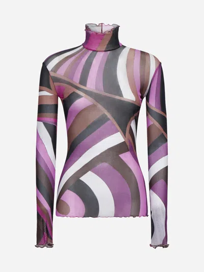 Iride top in printed semi-transparent tulle, high neck, long sleeves. This product, as well as many other Pucci items, is made with an all-over print that falls differently on each garment, the product shipped may differ from the one in the picture. Composition: 100% polyamide