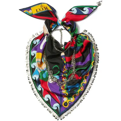 Black/multicolour silk twill weave geometric-pattern print logo print to the front chain-link detailing fringe detailingDimension: length: 90.0 centimetres, width: 90.0 centimetresPRINT PATTERNS MAY DIFFER SLIGHTLY