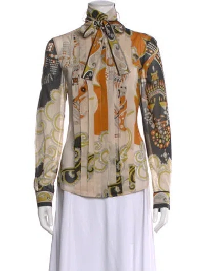 Emilio Pucci Silk Blouse Neutrals Patterned Long Sleeve with Tie Neck Designer size 46. Fit: Tops by Emilio Pucci typically fit true to size. | Emilio Pucci Silk Patterned Blouse in Neutrals, Women's US 12 | XL