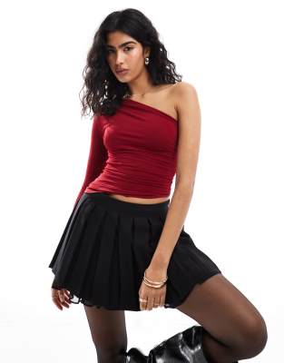 PULL & BEAR One Shoulder Ruched Side Top In Dark Red
