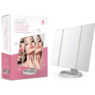 Portable and foldable, this three-panel vanity mirror is the ultimate beauty companion that offers crystal-clear views from multiple angles. The adjustable, soft LED light mimics natural daylight to help perfect your makeup, grooming and/or skincare routinue. 11" x 7.5" x 3" Plastic Imported