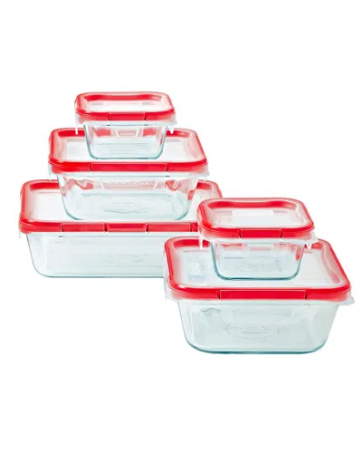Color/Finish: Red Design Details: Good Food Is Good To Goñto Office, Freezer, Fridge Or Cupboardñthanks To These Lock-In-Place Lids And Durable Pyrex¨ Glass Containers. The Colorful Plastic Lids In This 10-Piece Set Seal Out Air And Prevent Leaks. Just Fill, Label, Stack, And Then Nest To Store Compactly Till You Need Them Again. Materials: Glass Food Safe Dishwasher/Microwave Safe Made In The Usa Contents Of Set: Two 1 Cup Storage Dish With Lid (4.25In X 4.25In X 2.25In ). Two 4 Cup Storage Dish With Lid (6.75In X 6.75In X 3In ). One 6 Cup Storage Dish With Lid (8.5In X 6.5In X 2.25In ).