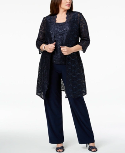 R & M RICHARDS 3-pc. Plus Size Sequined Lace Pantsuit & Shell In Navy