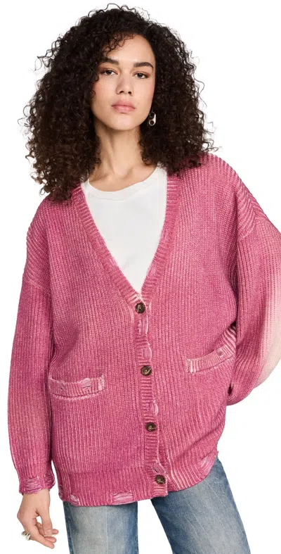R13 Oversized Cardigan in Raspberry Print - Pink. Size M (also in L, S, XS). 100% merino wool. Made in China. Hand wash. Front button closure. Front pouch pockets. Midweight knit fabric with intentional fading design. R13-WK215. R13WY198-Y173A. About the designer: Since its debut in 2009, R13's avant-garde denim silhouettes have garnered a cult status among those aiming to capture the rebellious American spirit. To achieve a vintage feel that doesn't warp or stretch, R13 uses Italian and Turkish denim produced in Italy, which features pure indigo casting along with machine hand washing techniques. The look is sharp and edgy, fit for the person who is effortlessly cool and fashion forward in their style.