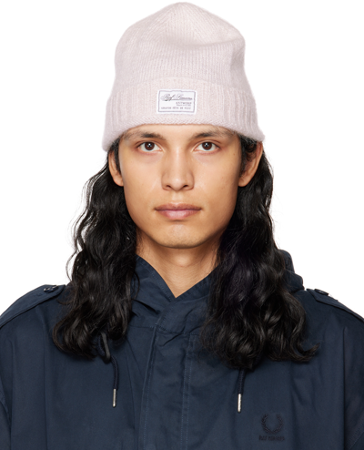 logo-patch beanie from RAF SIMONS featuring light pink, mohair-wool blend, knitted construction, ribbed-knit edge, logo patch to the front, curved peak and turn-up brim.