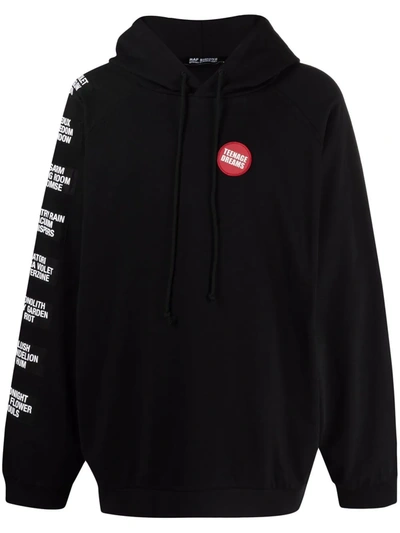 Black Cotton Oversized Hoodie By Raf Simons. Featuring: - Drawstring Hoood; - Red Patch At The Chest; - Long Sleeves; - Multiple Patches With Slogan Print Along The Sleeve; - Ribbed Hem And Cuffs. Composition: 100% COTTON