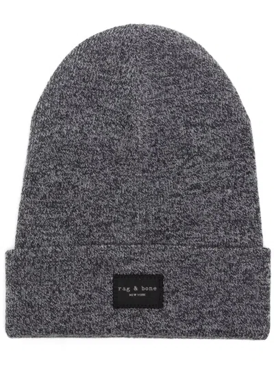 Addison knitted beanie from rag & bone featuring medium grey, wool blend, chunky ribbed knit, mélange effect, logo patch to the front, turn-up brim and pull-on style.