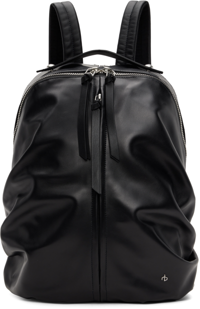 Buffed leather two-compartment backpack in black. · Carry handle · Adjustable padded shoulder straps · Zip pocket and logo hardware at face · Twin two-way zip closures · Laptop compartment, patch pockets, and zip pocket at interior · H18 x W16 x D5.5 in Supplier color: Black