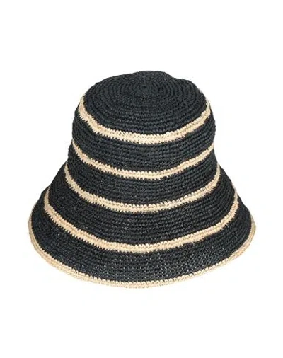 bucket hat, raffia, striped, leather trims, brand logo, narrow brim, soft visor, do not wash, do not bleach, do not tumble dry, do not iron, contains non-textile parts of animal origin , Color: Black , Size: M/L