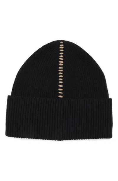 Tonal blanket stitching bisects the crown of this snug-fitting beanie that's knit in a ribbed stitch from wool-blend yarn and features a wide cuff for extra ear warmth. 96% wool, 3% nylon, 1% spandex Dry clean Imported