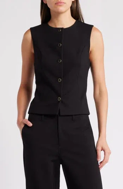 Shapely seams highlight the fitted silhouette and expert tailoring of this button-up vest featuring enameled buttons that lend an air of refined opulence. 21" length (size Medium) Front button closure Jewel neck Partially lined 75% viscose, 20% polyamide, 5% elastane Dry clean or machine wash, dry flat Imported