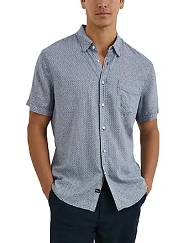 Made from a breezy linen blend, this short-sleeve button-up features a handy chest pocket and an allover geometric pattern. 29 1/2" length; 44" chest (size Medium) Front button closure Point collar Short sleeves Chest patch pocket Curved hem 55% linen, 45% viscose Machine wash, line dry Imported