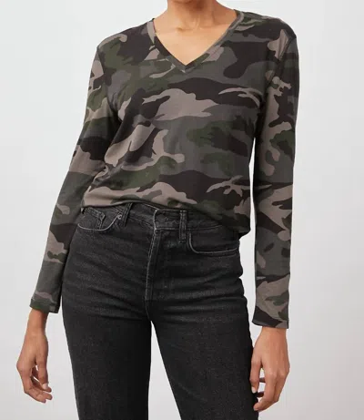 A long sleeve top you can wear with denim, skirts, well.just about anything!Lightweight, cotton modal, long sleeve, dark forest green and brown v-neck tee featuring tonal camo print throughout, relaxed fit, and dropped shoulder. This super soft tee features a cotton-modal fabric blend that provides an amazing hand feel and super drapey, flattering fit. 60% Cotton 40% Modal. Imported. Recommend ordering true to size. Front Body Length - 24 1/2" (Measured from Small). Model's Measurements - Height 5'10", Bust 34", Waist 25", Hips 35 1/2". Hand Wash Cold.