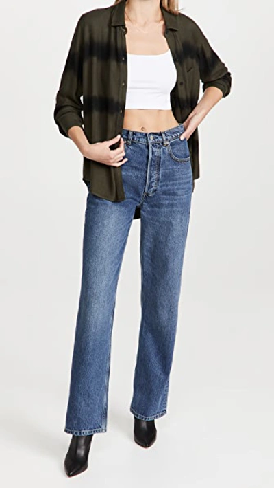 This twill shirt showcases a tie-dyed motif Spread collar Long sleeves Button placket Patch chest pocket 100% rayon Hand wash Imported SIZE & FIT About 27" from shoulder to hem Model measurements: 5'10" tall Model is wearing a US size Small. Contemporary Sportswear - Casual Separates > Saks Fifth Avenue > Barneys. Rails. Color: Olive Black Waves. Size: XS.