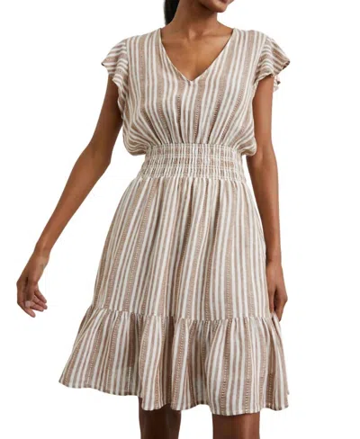 Rails "Tara" dress featured in a neutral-striped pattern made of the softest-feeling luxe linen fabric Approx. 31.1"L from shoulder to hem V neckline Flutter cap sleeves Shirred waistband Hem falls above the knee Flowy tiered skirt A-line silhouette Linen/viscose/cotton Lining: Cotton Hand wash Imported