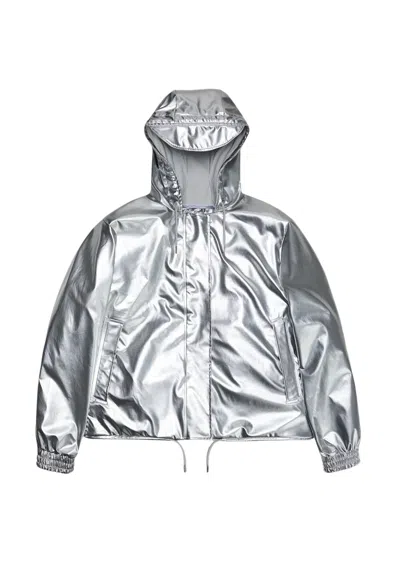 This utility jacket is the perfect combination of cool and feminine.Mirror-colored utility jacket designed for both style and function. Cropped, solid-colored jacket features long sleeves. Crafted from 100% polyester with a durable polyurethane coating, ensuring waterproof and windproof protection. Includes thoughtful elements such as slanted front pockets, an adjustable drawstring hem, and a signature brimmed hood, with a concealed snap closure for a sleek finish. Care instructions call for a machine wash on a delicate cycle in cold water and hanging to dry, making it perfect for the light traveler seeking practicality and fashion. Model wears size M, with the jacket fitting true to size.
