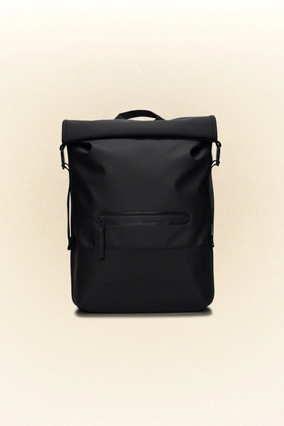 Trail Rolltop Rucksack is a sporty and utilitarian city staple, perfect for commutes on bike or foot. To protect essentials from rain, fold the rolltop into a tight scroll and secure using the signature carabiner. It also features an internal padded laptop pocket, front zip pocket and padded back panel. The design is finished with a buckle fastened chest strap for a secure ride-proof fit. Trail Rolltop Rucksack is cut in Rains’ signature waterproof PU fabric, engineered for carrying strength, durability, and a smooth feel.−| Material: | 100% polyester with polyurethane coating || ---------------------- | ----------------------------------------------- || Lining: | 100% polyester || Waterproof rating: | W3 – Waterproof protection from light rain || Water column pressure: | 8000mm || Measurements: | H47 x W36 x D13cm / H18.5 x W14.2 x D5.1 inches || Volume: | 19 liters / 5.1 gallons || Weight: | 898 g / 31.7 oz. |Features:* Rolltop opening with snap compression, to be securely closed and fastened to protect from rain* Side-mounted webbing straps with buckle closures* Single main compartment* Front pocket with coated zip* Padded mesh back panel* Adjustable padded backstraps* Webbing carry handle* Adjustable chest strap* This product is designed to withstand light to moderate weather conditions
