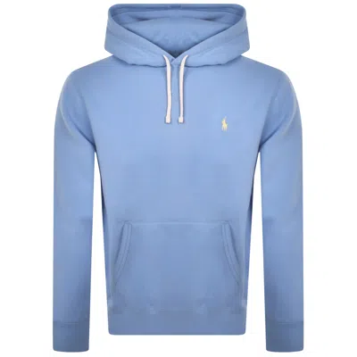 Ralph Lauren Classic Hoodie In Bristol Blue. The hood features contrast drawstrings in cream. Ribbed cuffs on the long sleeves and a ribbed waistband featuring a large kangaroo style pouch pocket at the waist. The signature Ralph Lauren Polo Player logo is embroidered on the left of the chest. Soft fleece interior. 60% Cotton And 40% Polyester.