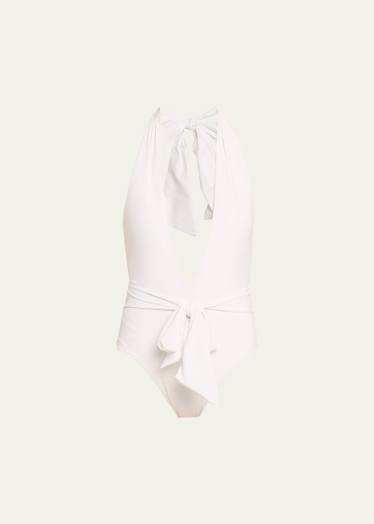 Ramy Brook "Raquel" solid one-piece swimsuit Plunging halter neckline; self-ties behind the neck Self-tie belted waist Open back Moderate seat coverage Nylon/polyamide/spandex Lining: Polyester/spandex Hand wash, wash separately Imported