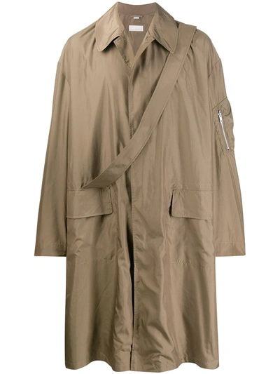 Beige trench coat from Random Identities. Featuring a spread collar, a concealed front fastening, a diagonal strap overlay to the front, long sleeves, zipped pocket at the sleeve, front flap pockets, a rear central vent, an oversized fit and a long length.