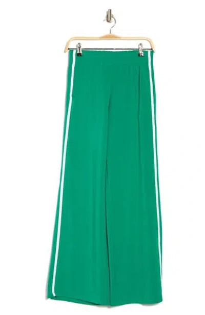 Contrasting piped trim at the sides brings sporty appeal to these ultrasoft knit pants cut with a wide leg and styled with handy pockets. 32" inseam; 13" front rise (size Medium) Elastic waist Front welt pockets 47% polyester, 43% rayon, 10% spandex Machine wash, tumble dry Imported