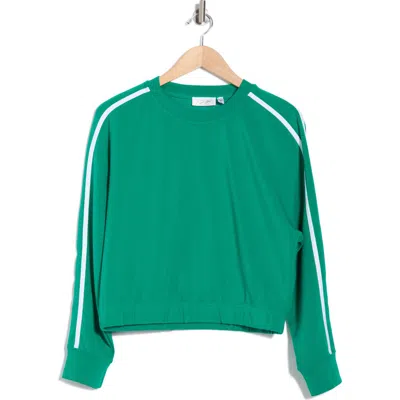 Sporty stripes race down the sleeves of this comfy crewneck pullover fashioned in a boxy silhouette with an elastic banded hem. 21" length (size Small) Crewneck Long sleeves with ribbed cuffs 47% polyester, 43% rayon, 10% spandex Machine wash, tumble dry Imported