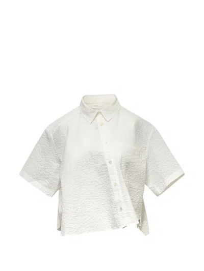 white seersucker texture asymmetrical design cropped style chest pocket button fastening