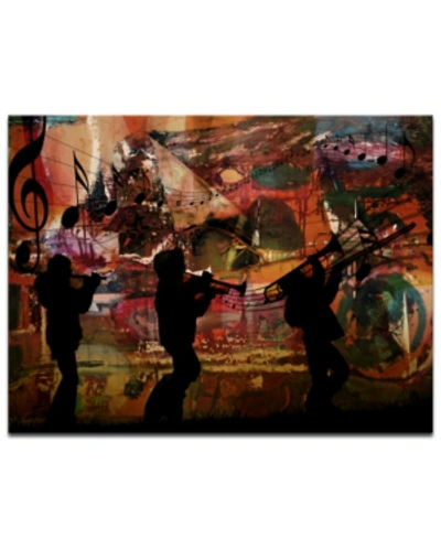 Musicians and music notes are silhouetted on top of bold strokes of color in Ready2HangArt's Jazz Trio contemporary abstract artwork printed on an oversized canvas.