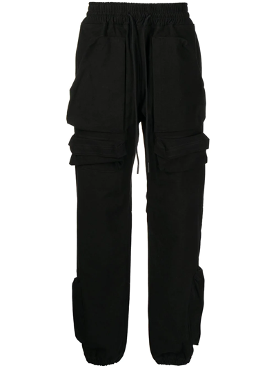 Black cotton logo-print cargo pants from READYMADE featuring logo print to the rear, multiple cargo pockets, elasticated waistband, straight leg, long length and elasticated ankles.