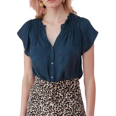 V Neck Floral Silk Jacquard Short Sleeved Blouse In Blue