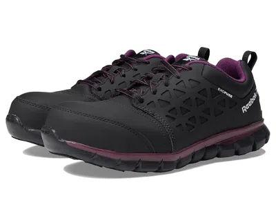 Reebok Work Sublite Cushion Work Comp Toe SD - Women's Work Boots : Black/Plum : The Reebok Work Sublite Cushion Work Comp Toe SD work shoe has a low cut silhouette and comfortable athletic construction with all the tough protection and lightweight comfort you need to perform at your best every workday. ; Lace-up work sneaker with a composite safety toe that meets ASTM F2413 I/75, C/75 and SD 10 (static dissipative) safety standards. ; Water-resistant microfiber and mesh upper with a 100% non-metallic construction. ; Dual resistor (SD 10) technology. ; Moisture-wicking nylon mesh lining. ; Removable footbed cushioned with MemoryTech Massage technology provides superior support and underfoot comfort. ; Sublite EVA midsole promotes lightweight cushioning and soft support. ; Slip-resistant rubber outsole meets and exceeds MARK II Standard of .53 oily/wet with forefoot pads for excellent traction. ; Imported. Measurements: ; Weight: 1 lb 8 oz ; Product measurements were taken using size 8, width B - Medium. Please note that measurements may vary by size. | Reebok Work Sublite Cushion Work Comp Toe SD Women's Work Boots Black/Plum : 11 D - Wide, Textile