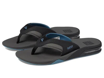 Reef Fanning - Men's Sandals : Grey/Light Blue : Where will the weekend take you? Stay primed for beach outings and backyard chill sessions in the cushioned comfort of the Reef Fanning sandals! ; Flip-flops in a modern silhouette with plenty of cushioning for beach and casual wear. ; Synthetic nubuck upper feature a water-friendly design. ; Perforated and padded liner for breathable, soft comfort against the foot. ; Water-friendly construction can handle any water adventure. ; High-rebound molded EVA footbed offers support and comfort for those long days at the beach. ; Molded rubber midsole and outsole unit: • 360° airbag under the heel offers premium cushioning. • Bottle opener built into the outsole to open your beverage after a surf session or hanging out at the pool. • Logo tread for long-lasting, grippy wear. ; Imported. Measurements: ; Weight: 7 oz ; Product measurements were taken using size 7, width D - Medium. Please note that measurements may vary by size. | Reef Fanning Men's Sandals Grey/Light Blue : 9 D - Medium, Synthetic