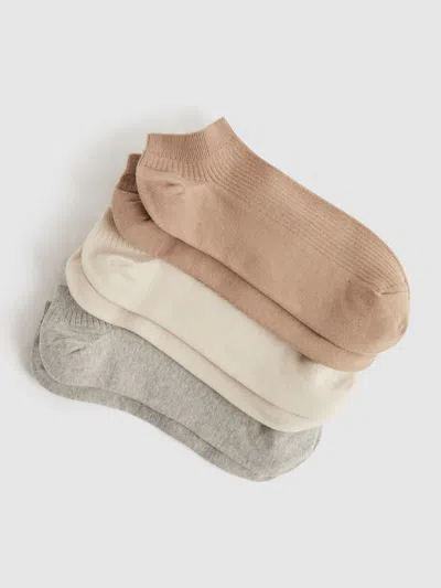 The Callie 3 pack are set to become your everyday go-to thanks to their comfortable cotton blend and versatile neutral palette. Each pair is finished with ribbed detailing to the front, and they finish at an ankle height. 3 pack of trainer socks Cotton blend Ribbed fabrication